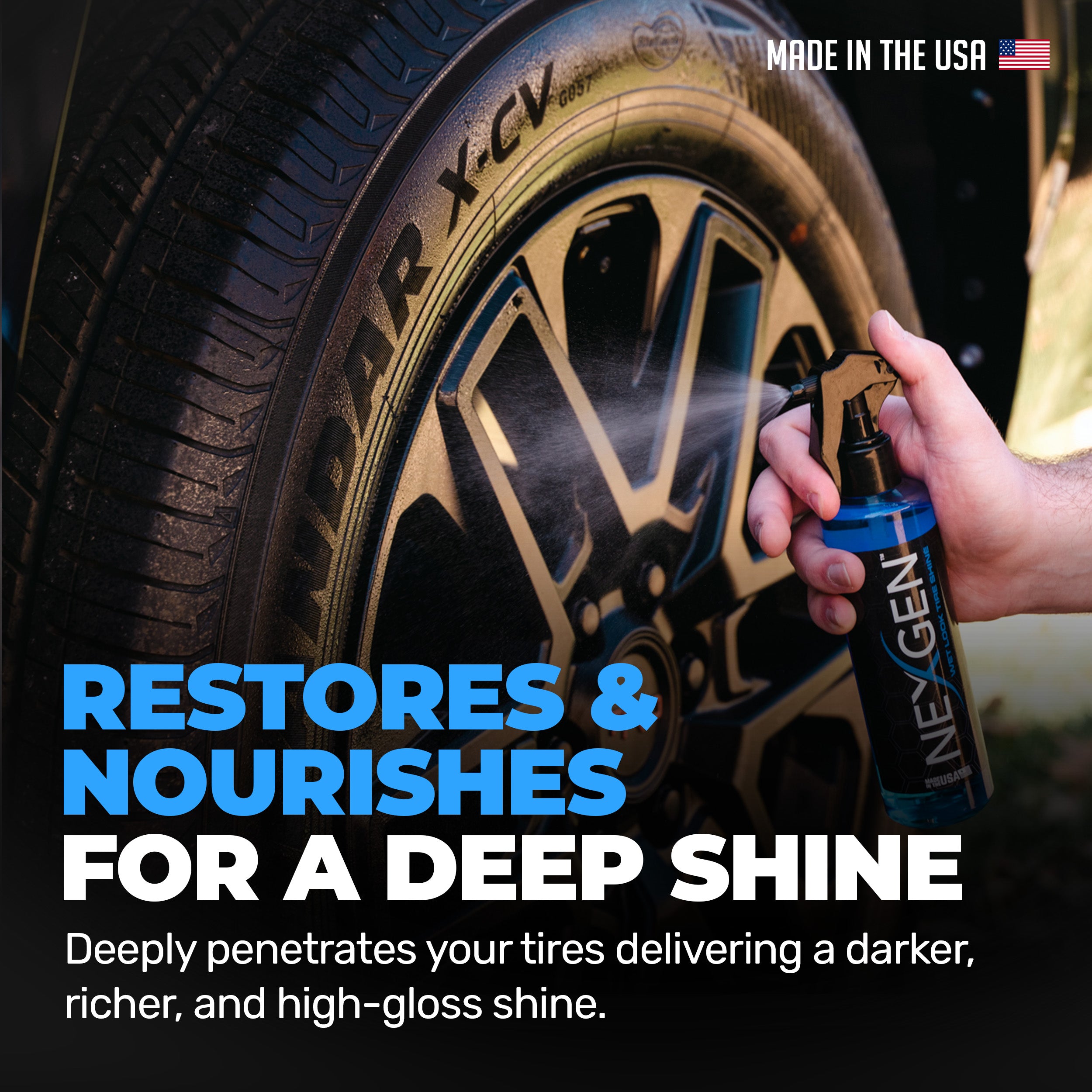 Moisturizes tires to extend their lifespan. It leaves behind an intense gloss that makes the oldest, most fatigued tires look brand-new.