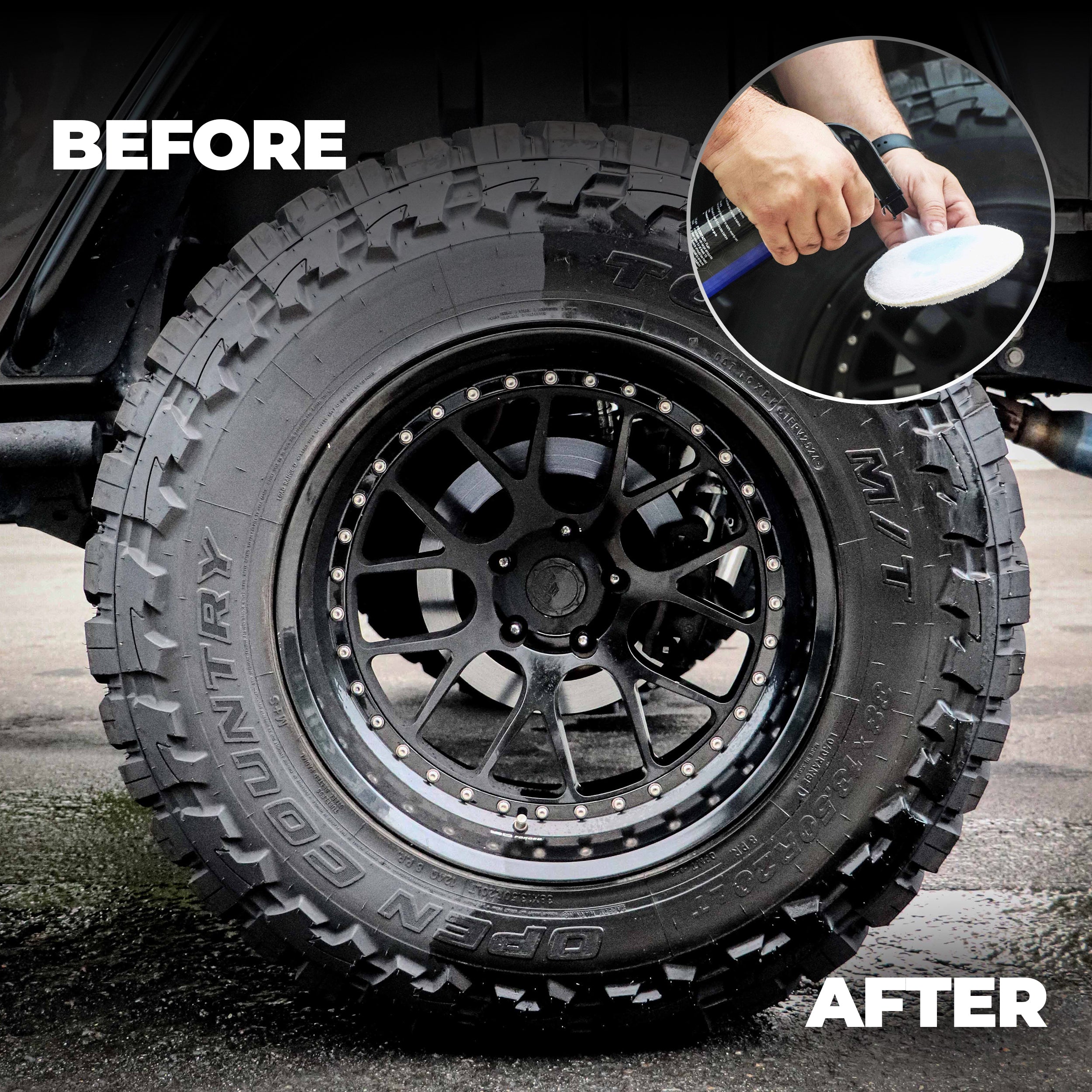 Our Wet Look Tire Shine works to enhance the appearance of your tires, leaving a beautiful glossy finish that you just can’t get with washing alone. Our Tire Dressing is similar, but is much less glossy and has a bit more moisturizing power.